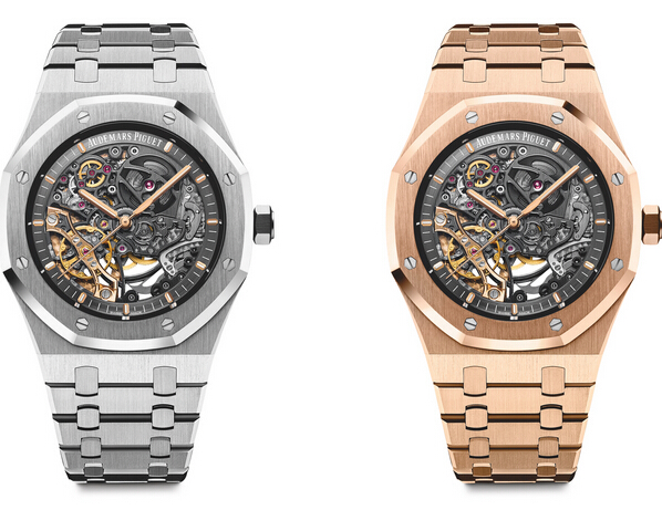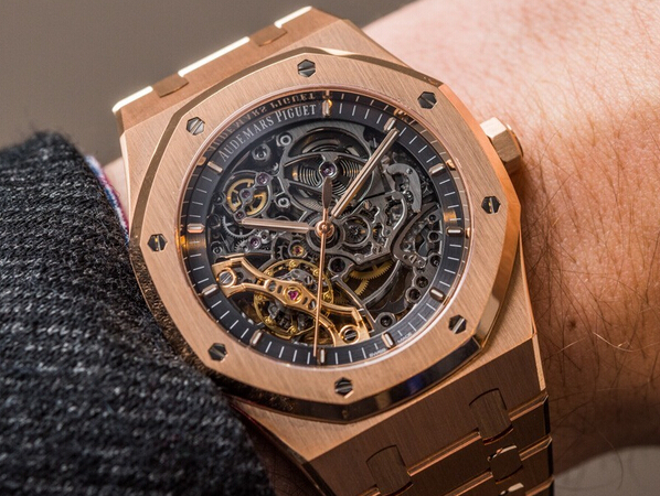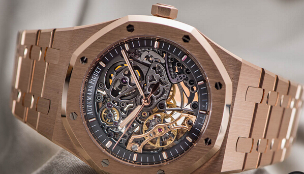 ・文字盤:スレートグレーダイヤル、オープンワーク、蓄光処理を施したピンクゴールドのアプライドアワーマーカーとロイヤルオーク針