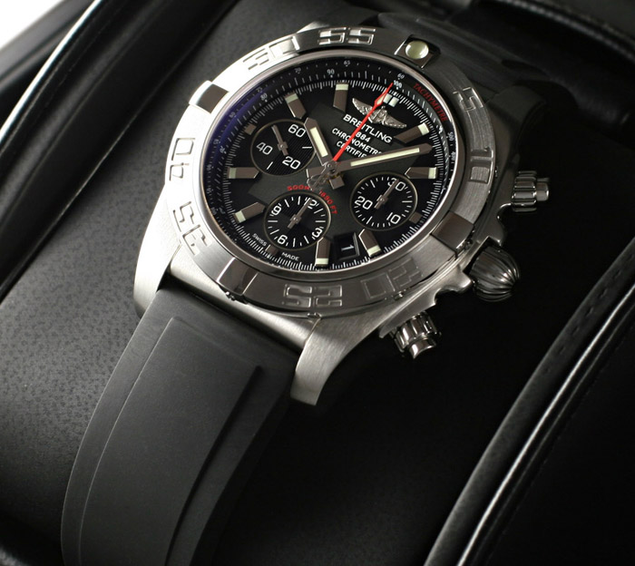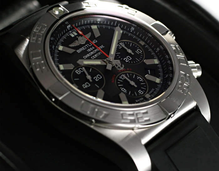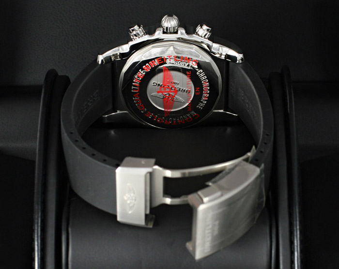 キャリバー: ブライトリング ウインドライダーB01(マニファクチュール) 自動巻 70時間パワーリザーブクロノメーター クロノグラフ: 1/4秒クロノグラフ秒針 30分計 12時間計 コラムホイールと垂直クラッチ式 ケース: ステンレススティール(以下SS) 直径43.5mm サテン(ヘアライン)/鏡面仕上げ 文字盤: 黒(ブラックオニキス)文字盤 4-5時位置間に日付 防水機能: 500m防水 ベゼル: SS サテン仕上げ ラチェット式逆回転防止ベゼル リューズ: SS ねじ込みロック式リューズ バックケース: ねじ込み式 ガラス: ドーム形サファイアクリスタル 両面無反射コーティング ベルト: ダイバーII黒ラバーバンド SSフォールディングバックル その他: サイズ調整について |
