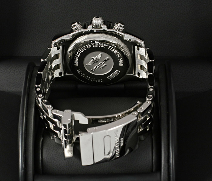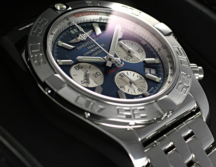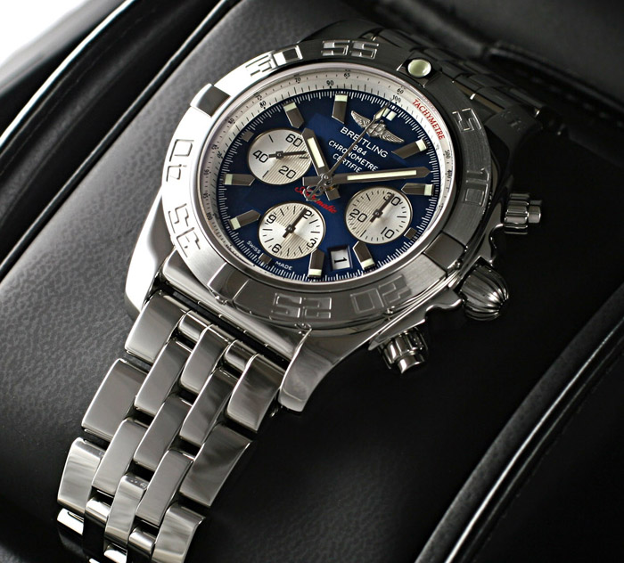 キャリバー: ブライトリング ウインドライダーB01(マニファクチュール) 自動巻 70時間パワーリザーブ クロノメーター クロノグラフ: 1/4秒クロノグラフ秒針 30分計 12時間計 コラムホイールと垂直クラッチ式 ケース: ステンレススティール(以下SS) 直径43.5mm 文字盤: 青/銀(メタリカブルー)文字盤 4-5時位置間に日付 防水機能: 500m防水 ベゼル: SS サテン(ヘアライン)仕上げ ラチェット式逆回転防止ベゼル リューズ: SS ねじ込みロック式リューズ バックケース: ねじ込み式 ガラス: ドーム形サファイアクリスタル 両面無反射コーティング ベルト: SSパイロットブレスレット |