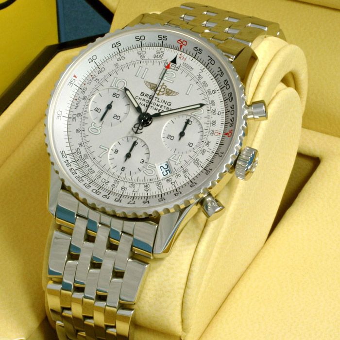 キャリバー: 自動巻き ブライトリング23 42時間パワーリザーブ 毎時28,800回転 クロノグラフ: 1/4秒クロノグラフ秒針、30分計、12時間計 ケース: ステンレススティール(SS) 直径 41.8mm 厚さ 14.6mm 文字盤: 銀文字盤/アラビア数字 防水機能: 3気圧 (日常生活防水) ベゼル: 両方向回転ベゼル(回転計算尺) 竜頭: 非ねじ込みロック式 バックケース: ねじ込み式 ガラス: ドーム形サファイアクリスタル、両面無反射コーティング バンド:SS ナビタイマーブレスレット |