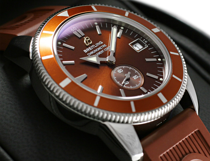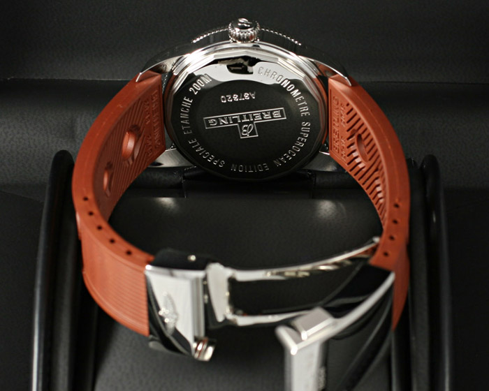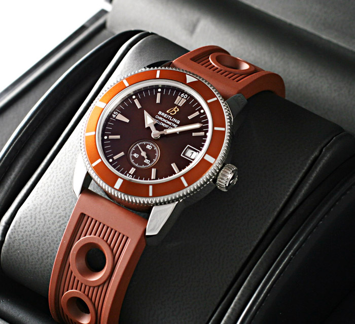 キャリバー: ブライトリング37 自動巻クロノメーター 42時間パワーリザーブ 毎時28800回転 ケース: ステンレススティール(SS) 直径38mm 文字盤: ブロンズ(茶)文字盤 3時位置デイト 6時位置スモールセコンド(秒針) 防水機能: 200m防水 ベゼル: SS with ブロンズアルミニウムベゼル(逆回転防止) 竜頭: ねじ込み式リューズ バックケース: SS ねじ込み式 ガラス: ドーム形サファイアクリスタル 両面無反射コーティング バンド: ブロンズオーシャンレーサーラバーベルト フォールディングバックル(スライド式微調整) その他: サイズ調整について |
