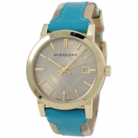 バーバリーの「BU9018」 ステンレスの丸型ケースとレザー素材のベルト。文字盤には3時位置に日付表示機能、12時位置にブランドロゴを配置しています。インデックスはバーインデックスを採用。また、中留め構造は穴留め式です。