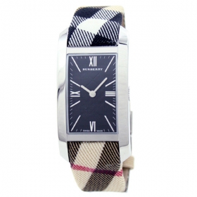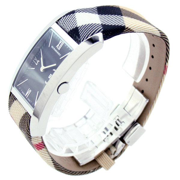 バーバリーの「ヘリテージ」 シルバーのケースに文字盤はブラック、中央にはチェック模様が刻み込まれ、ローマ数字とバーインデックスが採用されています。ベルトのキャンバス生地にもバーバリーチェックの模様が施されています。