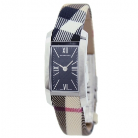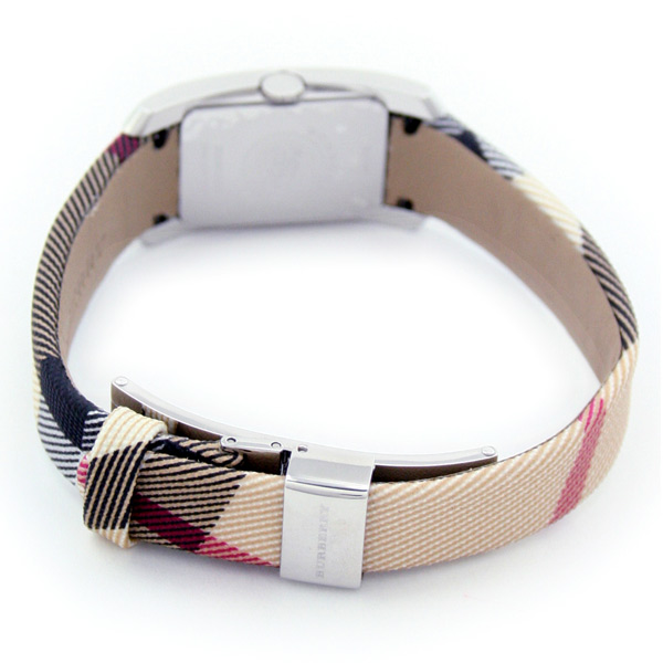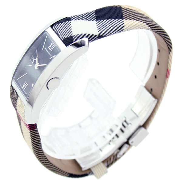 バーバリーの「ヘリテージ」 シルバーのケースに文字盤はブラック、中央にはチェック模様が刻み込まれ、ローマ数字とバーインデックスが採用されています。ベルトのキャンバス生地にもバーバリーチェックの模様が施されています。