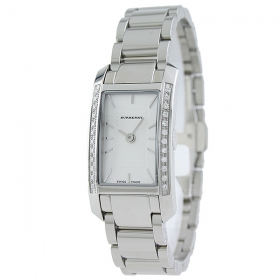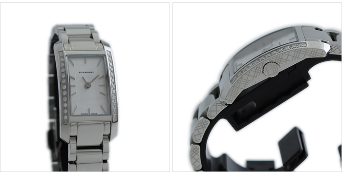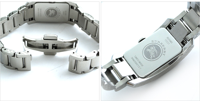 バーバリーの「BU1065」 ステンレス素材で統一された長方形型ケースとベルト。シルバーの文字盤には12時位置にブランドロゴを配置しています。インデックスは、バーインデックスを採用。また、中留め構造は両開きプッシュ式です。