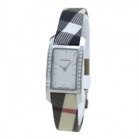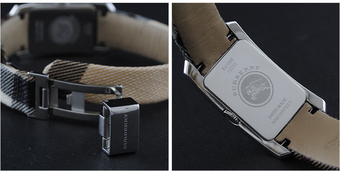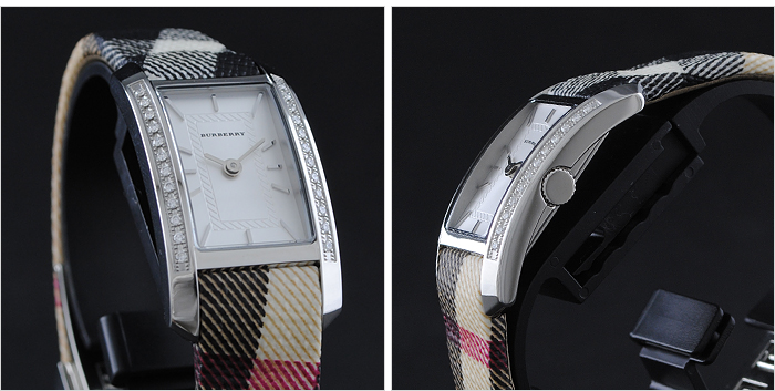 バーバリーの「BU1066」 ステンレス素材の長方形型ケースとキャンバス素材とレザー素材のベルト。文字盤には、12時位置にブランドロゴを配置しています。インデックスには、バーインデックスを採用。また、中留め構造は穴留め式です。