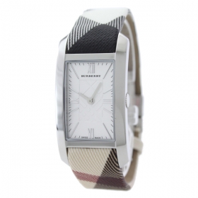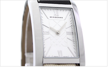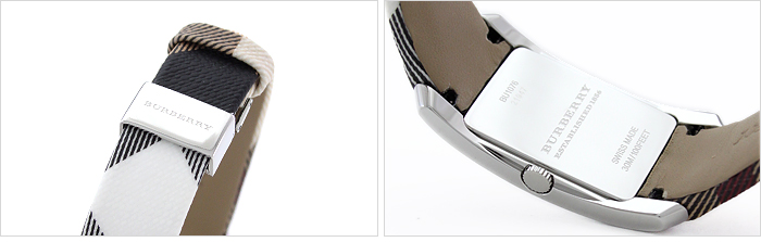 バーバリーの「BU1076」 ステンレス素材の長方形型ケースとレザー素材とキャンバス素材のベルト。文字盤には、12時位置にブランドロゴを配置しています。インデックスには、ローマ数字とバーインデックスを採用。また、中留め構造はディプロイバックル式です。