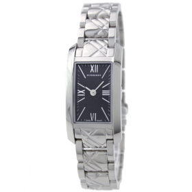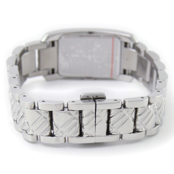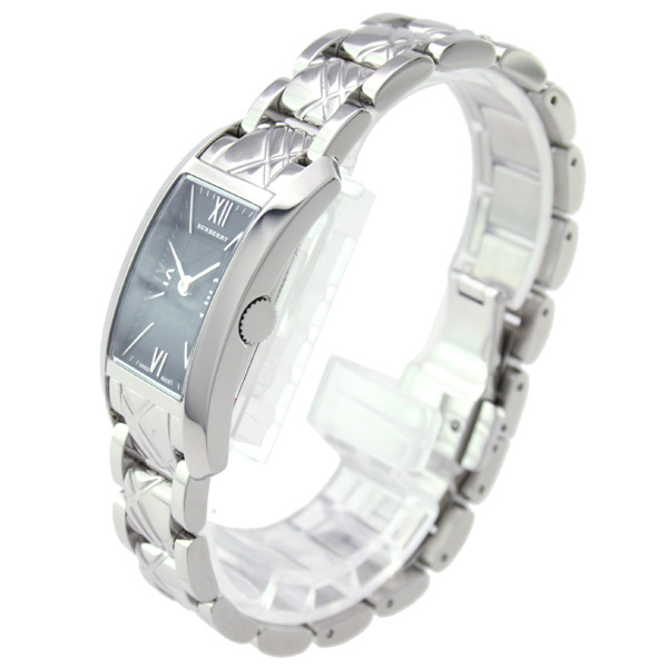 バーバリーの「BU1099」 シルバーのステンレススチールベルトにステンレスの長方形ケース。ブラックの文字盤にはローマ数字とバーインデックスを採用。12時位置にブランドロゴが配置されています。また、中留めには両開きプッシュタイプを採用しています。