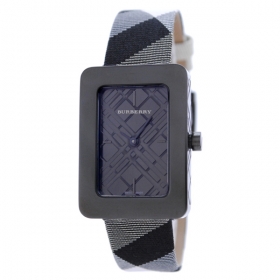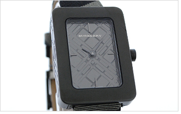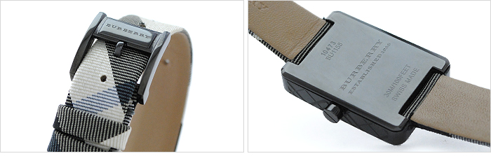 バーバリーの「BU1158」 ステンレス素材の長方形型ケースとキャンバス素材とレザー素材のベルト。グレーの文字盤には、12時位置にブランドロゴを配置しています。インデックスにはバーインデックスを採用。また、中留め構造は穴留め式です。