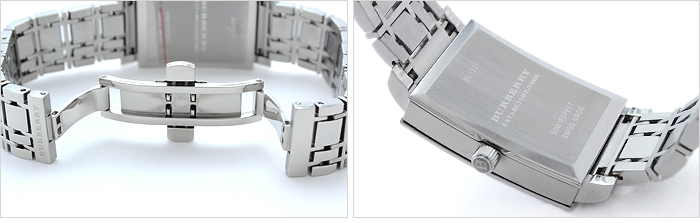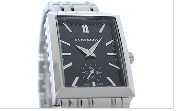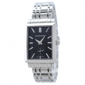バーバリーの「BU1321」 ステンレス素材で統一された長方形型ケースとベルト。ブラックの文字盤には、6時位置にスモールセコンド、12時位置にブランドロゴを配置しています。また、中留め構造は両開きプッシュ式です。