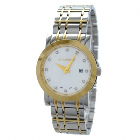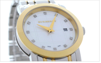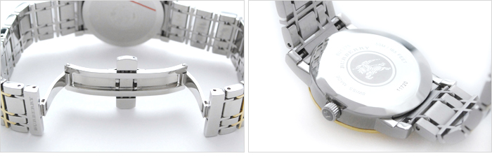 バーバリーの「BU1375」 ステンレス素材で統一された円形型ケースとベルト。文字盤には3時位置に日付表示機能を配置しています。インデックスはダイアモンドインデックスを採用。また、中留め構造は両開きプッシュ式です。