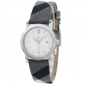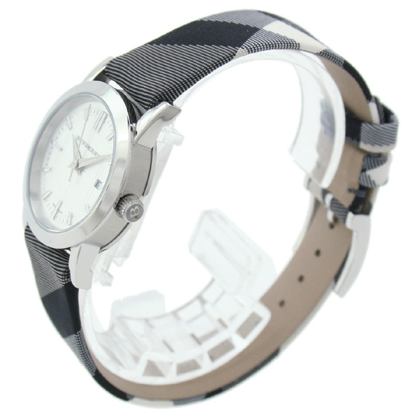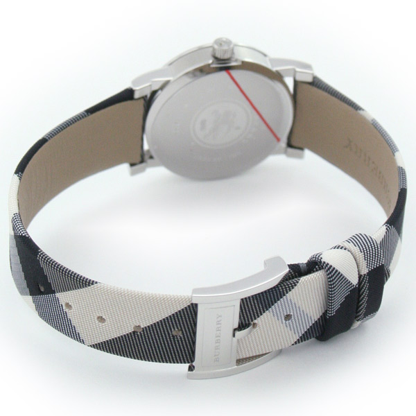 バーバリーの「ヘリテージ」 華奢なボディにバーバリーチェックのベルトが愛らしいデザイン。リューズにはバーバリーの「B」の文字がデザインされています。3時位置には日付表示機能を配置しています。