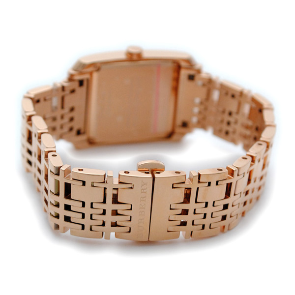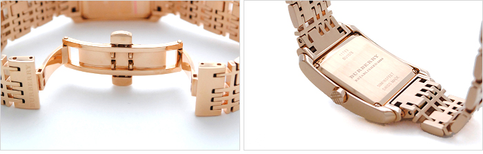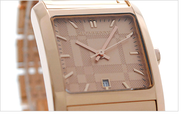 バーバリーの「BU1578」 ステンレス素材で統一された長方形型ケースとベルト。文字盤には6時位置に日付表示機能を配置しています。インデックスはバーインデックスを採用。また、中留め構造は両開きプッシュ式です。