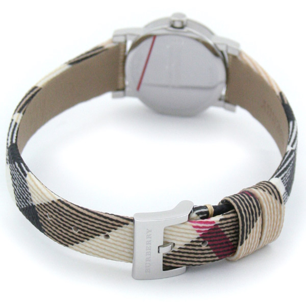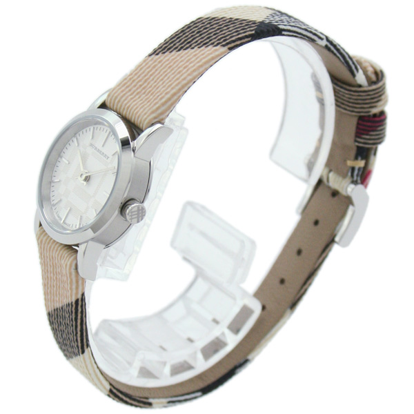 バーバリーの「BU1759」 シルバーのケースにホワイトの文字盤。文字盤の12時位置にはブランドロゴを印字されて、インデックスはバーインデックスが配置されています。ベージュとブラックのベルトには穴止めタイプが採用されています。