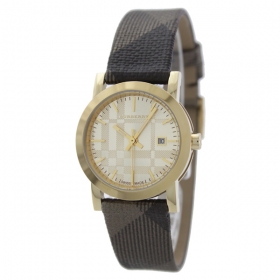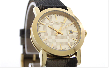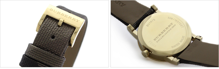 バーバリーの「BU1875」 ステンレス素材の円形型ケースとレザー素材のベルト。ゴールドの文字盤には3時位置に日付表示機能、12時位置にブランドロゴを配置しています。インデックスにはバーインデックスを採用。また、中留め構造は穴留め式です。