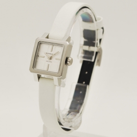 ガラス:ミネラル ケース・ベルト:ステンレス/レザー 文字盤:シルバー ケース・ベルト:シルバー/ホワイト 文字盤:縦約1.4cm×横約1.4cm ケース:縦約1.8cm×横約2.0cm(リューズ含む) 厚み :約0.5cm ベルト:約14.5cm~約17.0cm クォーツ 日常生活防水 専用ケース、取扱説明書、保証書(保証期間:1年) |