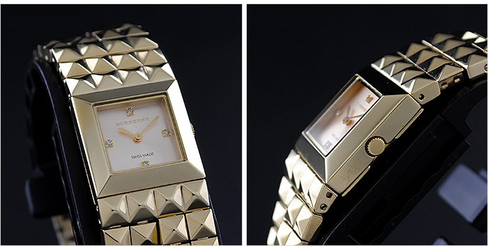 バーバリーの「BU5351」 ステンレス素材で統一された四角型ケースとベルト。文字盤の12時位置にはブランドロゴを配置しています。指針にはシンプルな2針タイプを採用。また、中留め構造はジュエリーバックル式です。