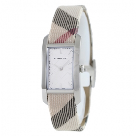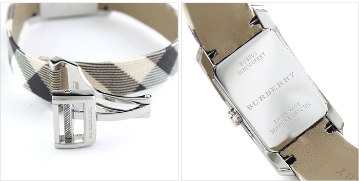 バーバリーの「BU9503」 ステンレス素材の長方形型ケースとレザー素材のベルト。文字盤には12時位置にブランドロゴを配置しています。インデックスとしてバーインデックスを採用。また、中留め構造はディプロイバックル式です。