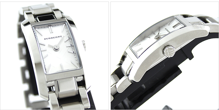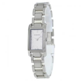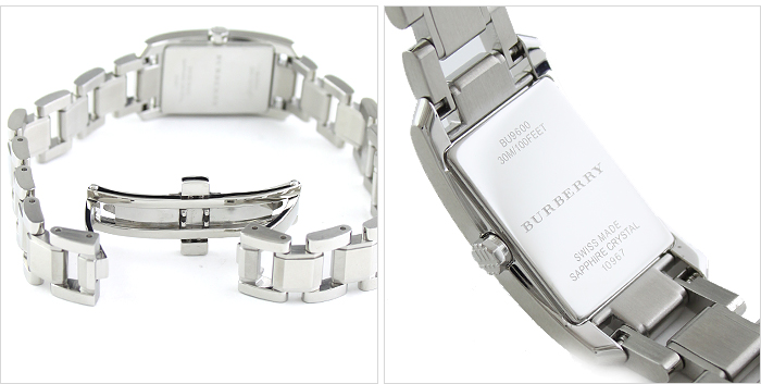 バーバリーの「BU9600」 ステンレス素材で統一された長方形型ケースとベルト。文字盤には12時位置にブランドロゴを配置しています。インデックスとしてバーインデックスを採用。また、中留め構造は両開きプッシュ式です。