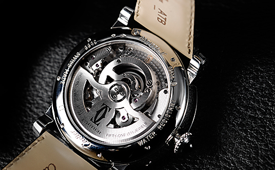 仕様:Pt製パール状の飾り付きリューズにサファイアカボション、シースルーバック 、世界限定100本、個別の限定製造番号入り