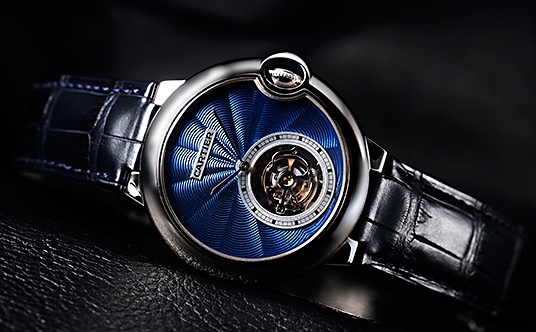 この文字盤は、20世紀初頭にカルティエが製作したクロックが原点。18KWGのプレートにギョシェ彫りでサンレイ・モチーフ(太陽光の放射)を描き、半透明のブルー・エナメルを何層にも塗り重ねている。 BALLON BLUE DE CARTIER FLYING TOURBILLON ENAMEL WATCH
