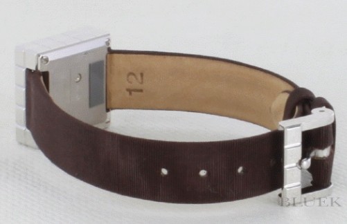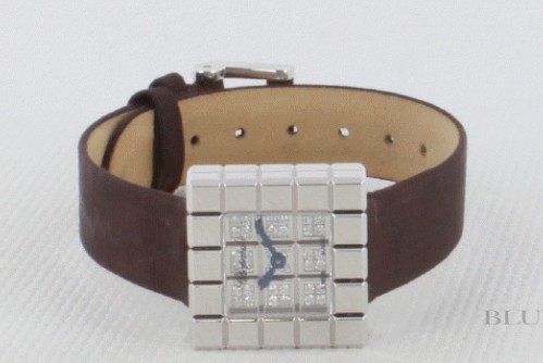 金無垢ホワイトゴールドのスクエアボディにダイヤ文字盤が煌めき、ブラウンサテンレザーがモダンに仕上げたアイスキューブです。フェイスにはダイヤの光に照らされブルーの指針が時を刻みます。20mmサイズで小振りながら素敵なデザインが手元を飾ります。