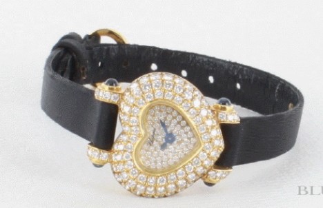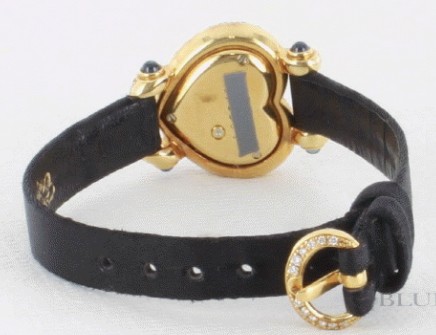 イエローゴールド金無垢ボディにダイヤのハートケースや、ブラックサテンレザーが華やかシックに仕上げたハートです。フェイスに広がるダイヤは眩しく、ブルーの指針が時を刻みます。22×19mmサイズがしっくりと手元にフィットし、シーンを華やかに演出する時計です。