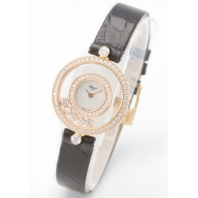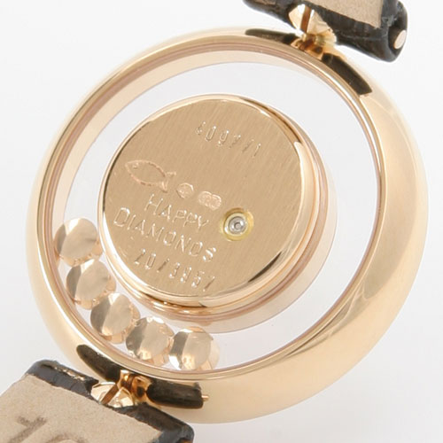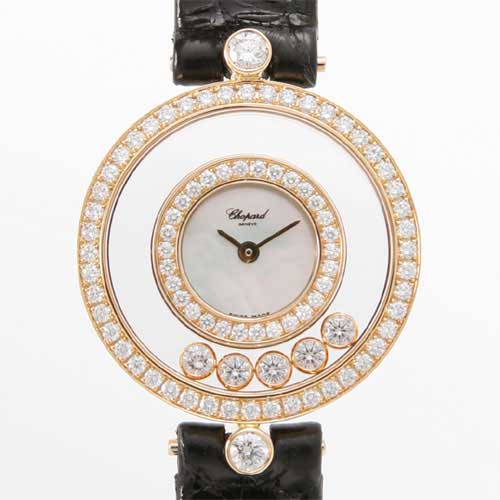 フェイスを囲むダイヤモンド、文字盤に揺れるダイヤモンド、そしてイエローゴールドと眩しいほどゴージャスなデザイン。中央のシェル文字盤が小振りで可愛らしい印象です。ベルトとフェイスの接続部分にもダイヤモンドが。