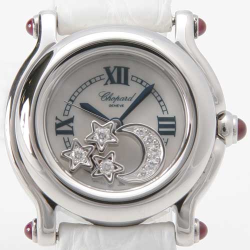 まるで夜空を思わせるようなムーン&スターダイヤ。シェル文字盤は受ける光の角度によって様々な表情を見せます。ケースサイドにはルビーがあしらわれ、見ているだけで愛しい気持ちにさせてくれそう。揺れるダイヤがとてもキュート。