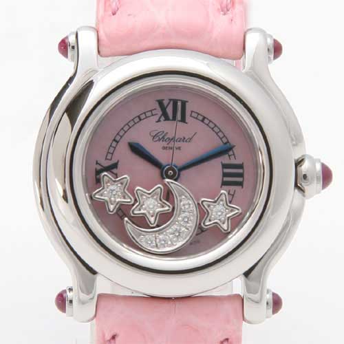まるで夜空を思わせるようなムーン&スターダイヤ。シェル文字盤は受ける光の角度によって様々な表情を見せます。ケースサイドにはルビーがあしらわれ、見ているだけで愛しい気持ちにさせてくれそう。揺れるダイヤがとてもキュート。