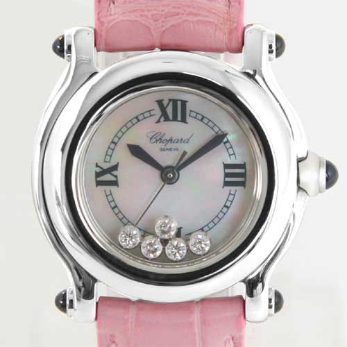 ホワイトシェル文字盤にブルーの指針、ローマンインデックスを配置。12時位置にブランドロゴ。5粒のダイヤモンドが文字盤上で揺れ動きます。