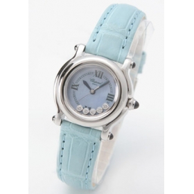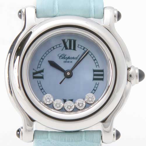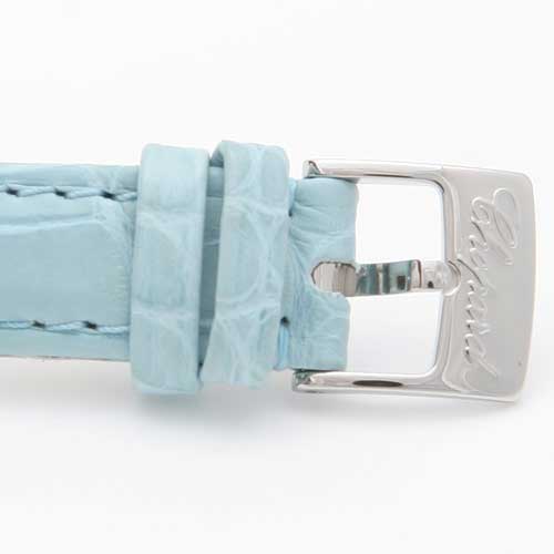 5ポイントのダイヤが文字盤の上を揺れながらキラキラと流れます。さらにシェル文字盤が光を反射しながら様々な表情に。ケースサイドにはブルーサファイアがバランスよくあしらわれ、可愛らしさの中に高級感漂うデザインになっています。