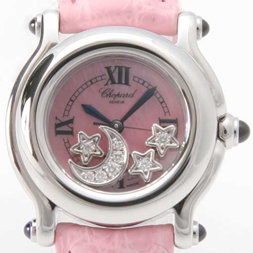 まるで夜空を思わせるようなムーン&スターダイヤ。シェル文字盤は受ける光の角度によって様々な表情を見せます。ケースサイドにはブルーサファイアがあしらわれ、見ているだけで愛しい気持ちにさせてくれそう。揺れるダイヤがとてもキュート。