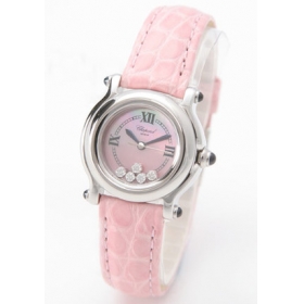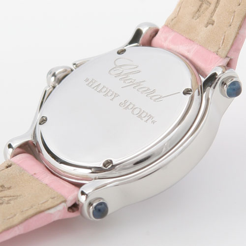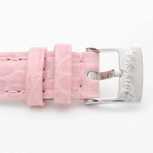 5ポイントのダイヤが文字盤の上を揺れながらキラキラと流れます。さらにシェル文字盤が光を反射しながら様々な表情に。ケースサイドにはブルーサファイアがバランスよくあしらわれ、可愛らしさの中に高級感漂うデザインになっています。