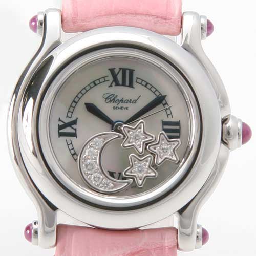 まるで夜空を思わせるようなムーン&スターダイヤ。シェル文字盤は受ける光の角度によって様々な表情を見せます。ケースサイドにはピンクサファイアがあしらわれ、見ているだけで愛しい気持ちにさせてくれそう。揺れるダイヤがとてもキュート。