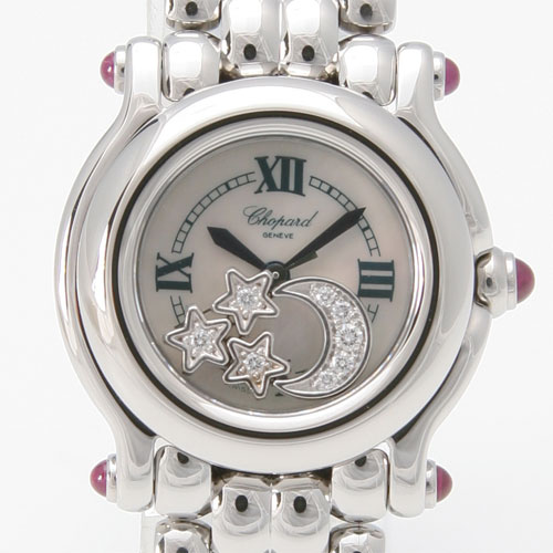 まるで夜空を思わせるようなムーン&スターダイヤ。シェル文字盤は受ける光の角度によって様々な表情を見せます。ケースサイドにはルビーがあしらわれ、見ているだけで愛しい気持ちにさせてくれそう。揺れるダイヤモンドがとてもキュート。