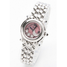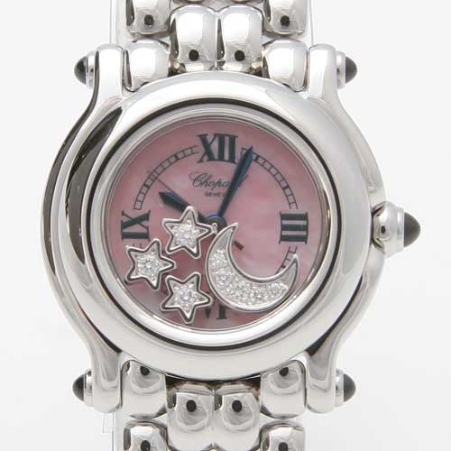 ピンクシェル文字盤にブルーの指針、ローマンインデックスを配置。12時位置にブランドロゴ。ムーン&スターダイヤが文字盤上で揺れ動きます。