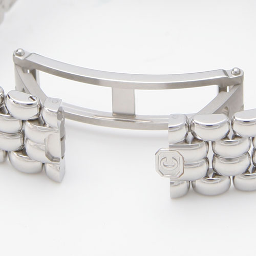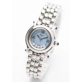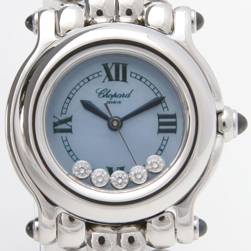 5粒のダイヤが文字盤の上を揺れながらキラキラと流れます。さらにシェル文字盤が光を反射しながら様々な表情に。ケースサイドにはブルーサファイアがバランスよくあしらわれ、可愛らしさの中に高級感漂うデザインになっています。