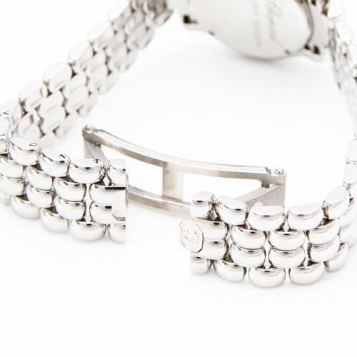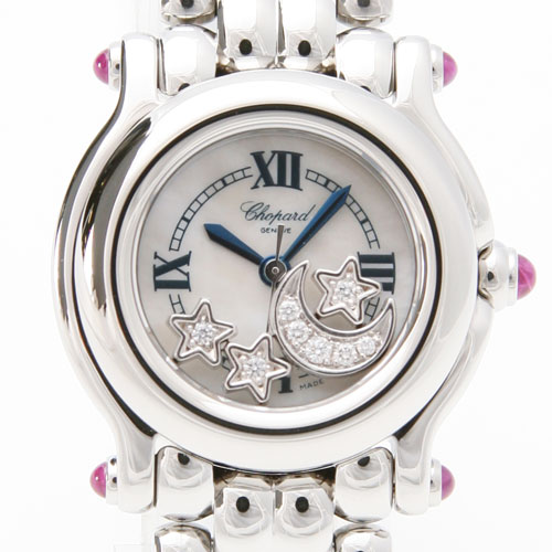 まるで夜空を思わせるようなムーン&スターダイヤ。シェル文字盤は受ける光の角度によって様々な表情を見せます。ケースサイドにはピンクサファイアがあしらわれ、見ているだけで愛しい気持ちにさせてくれそう。揺れるダイヤモンドがとてもキュート。