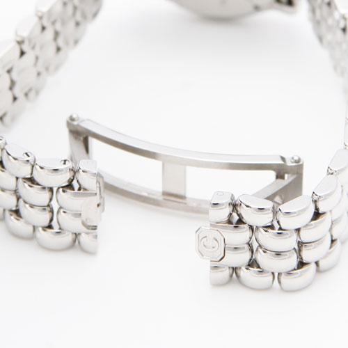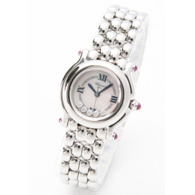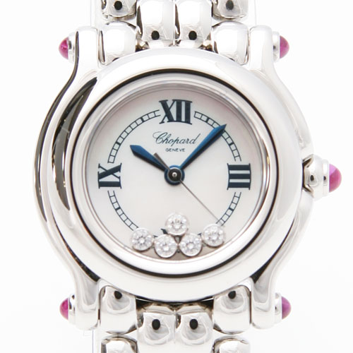 5粒のダイヤモンドが文字盤の上を揺れながらキラキラと流れます。さらにシェル文字盤が光を反射しながら様々な表情に。ケースサイドにはピンクサファイアがバランスよくあしらわれ、可愛らしさの中に高級感漂うデザインになっています。