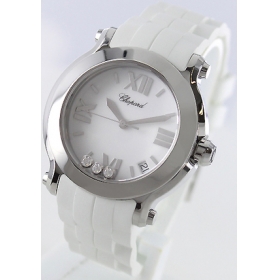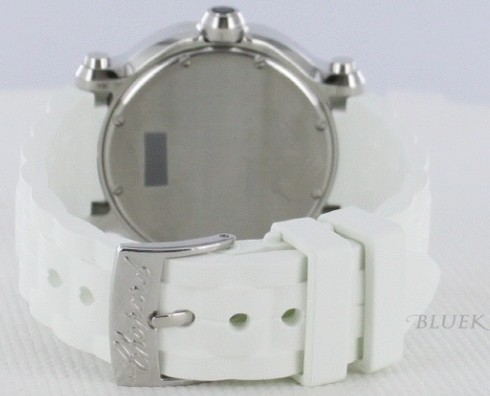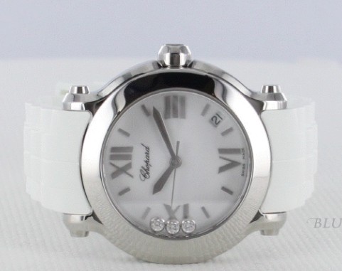 ホワイト文字盤と風防の間に3ピースのダイヤがコロコロと煌き、ホワイトラバーが清楚かつスポーティに 魅せるウォッチです。鏡面の様なラウンドケースにシルバーのローマンインデックスや指針が艶々と時を刻み、4時位置にさりげなく日付表示。リューズにはブ ルーサファイヤが施されスパイシーな光を放ちます。可愛らしいオーラで幸せを感じるモデルです。