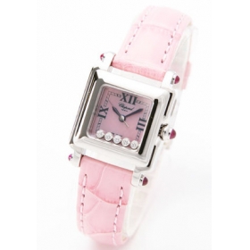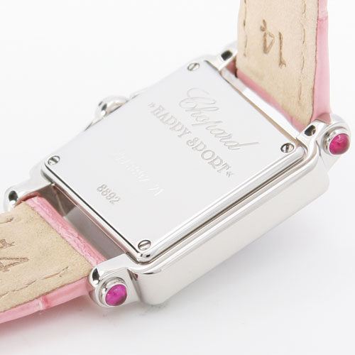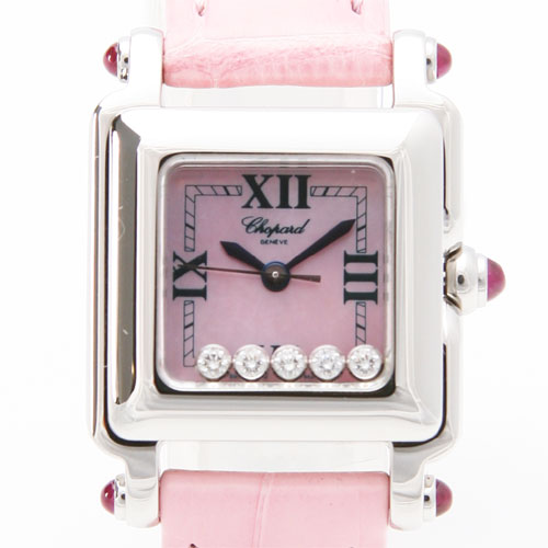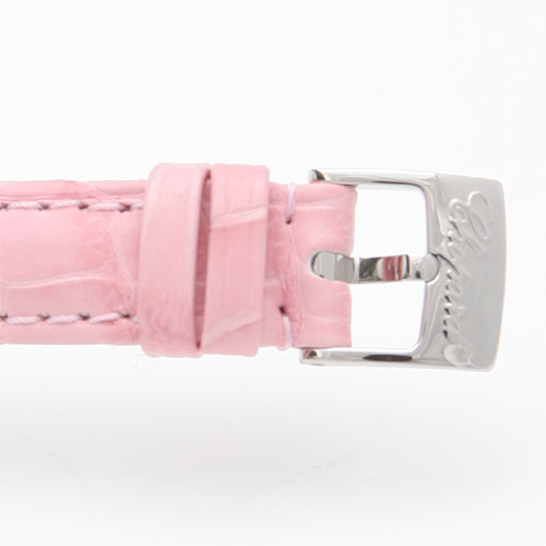 5粒のダイヤモンドが文字盤の上を揺れながらキラキラと流れます。さらにシェル文字盤が光を反射しながら様々な表情に。ケースサイドにはルビーがバランスよくあしらわれ、可愛らしさの中に高級感漂うデザインになっています。