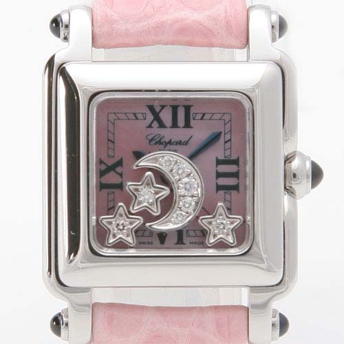 まるで夜空を思わせるようなムーン&スターダイヤ。シェル文字盤は受ける光の角度によって様々な表情を見せます。ケースサイドにはブルーサファイアがあしらわれ、見ているだけで愛しい気持ちにさせてくれそう。揺れるダイヤモンドがとてもキュート。