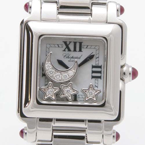 まるで夜空を思わせるようなムーン&スターダイヤ。シェル文字盤は受ける光の角度によって様々な表情を見せます。ケースサイドにはルビーがあしらわれ、見ているだけで愛しい気持ちにさせてくれそう。揺れるダイヤモンドがとてもキュート。