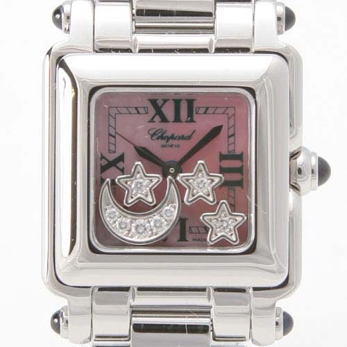 まるで夜空を思わせるようなムーン&スターダイヤ。シェル文字盤は受ける光の角度によって様々な表情を見せます。ケースサイドにはブルーサファイアがあしらわれ、見ているだけで愛しい気持ちにさせてくれそう。揺れるダイヤモンドがとてもキュート。