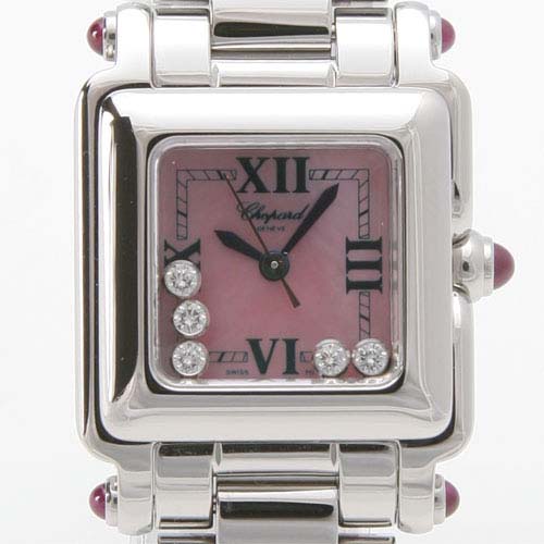 5粒のダイヤモンドが文字盤の上を揺れながらキラキラと流れます。さらにシェル文字盤が光を反射しながら様々な表情に。ケースサイドにはルビーがバランスよくあしらわれ、可愛らしさの中に高級感漂うデザインになっています。