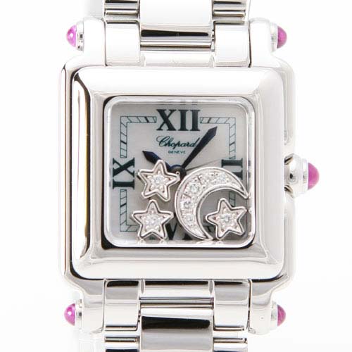 まるで夜空を思わせるようなムーン&スターダイヤ。シェル文字盤は受ける光の角度によって様々な表情を見せます。ケースサイドにはピンクサファイアがあしらわれ、見ているだけで愛しい気持ちにさせてくれそう。揺れるダイヤモンドがとてもキュート。