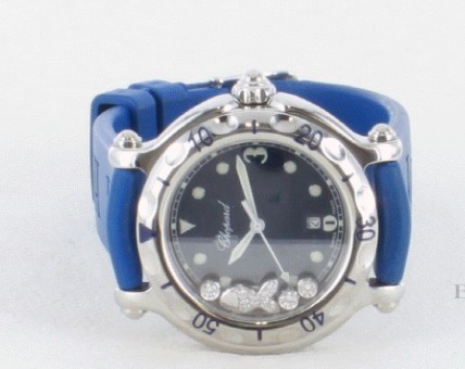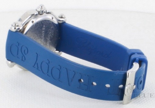 シルバーボディにダイヤのフィッシュとブルーの文字盤が浮かび、ラバーが煌めきユーモアに仕上げたハッ ピースポーツです。フェイスにはフィッシュとダイヤの粒が海中を遊泳しているかのよう。蛍光塗料を施した指針やインデックスは視認性に富みます。32mm サイズが扱いやすく、目を惹く存在感を放つモデルです。