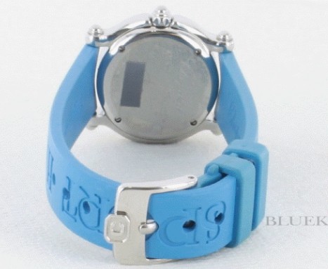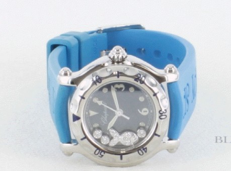 シルバーボディにダイヤのフィッシュとブルーの文字盤が浮かび、ライトブルーラバーが煌めきポップに仕 上げたハッピースポーツです。フェイスにはフィッシュとダイヤの粒が海中を遊泳しているかのよう。蛍光塗料を施した指針やインデックスは視認性に富みま す。26mmサイズが扱いやすく、目を惹く存在感を放つモデルです。