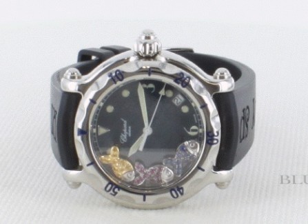 シルバーボディに3色のフィッシュとブラックシェルが浮かび、ブラックラバーがユーモアスポーティに仕 上げたハッピースポーツです。フェイスにはフィッシュ模様とピンクサファイヤ・ブルーサファイヤ・イエローサファイヤが海中を遊泳しているかの様。蛍光塗 料を施した指針やインデックスは視認性に富みます。38mmサイズが扱いやすく、目を惹く存在感を放つモデルです。
